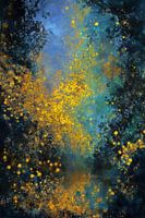 In dit mysterieuze bos ontvouwt zich een tapijt van dieppaars en nachtelijk blauw, doorspekt met honderden warme, gouden stipjes die als vuurvliegjes tussen de bomen dwalen. De silhouetten van donkere stammetjes omlijsten een zachte lichtval, alsof de nacht kort openbreekt om een blik op verborgen wonderen te gunnen.