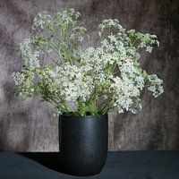 Boeket fluitenkruid in zwarte vaas. Stilleven met bloemen. De lente komt binnen met dit voorjaarsboeket.