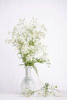 Witte schermbloemen van het fluitenkruid in een witte vaas met een witte onder- en achtergrond zorgen voor een zacht en sereen stilleven. Op een tak liggend naast de vaas zit een klein geel groen vlindertje.
