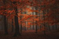 Fluweel rood bos in de mist . brengt een warme sfeer in uw kamer en is makkelijk inpasbaar.Zeer geschikt voor behang en poster.