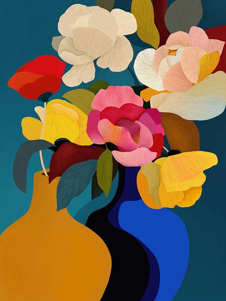 Een modern abstract stilleven met gelaagde, gestructureerde bloemen in gedurfde, harmonieuze kleuren, gerangschikt in sculpturale vazen die warmte, rust en speelse elegantie in evenwicht brengen.