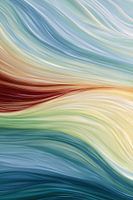 Golvende lijnen in zachte crème, diepgroen en oceaantinten ontmoeten een krachtige streep van bordeaux. Elke penseelachtige beweging vormt een vloeiende boog die het licht vangt en subtiel reflecteert, met een gelaagde textuur die uitnodigt tot nader onderzoek. Het contrast tussen warme en koele tinten geeft het werk een dynamische balans van energie en sereniteit.