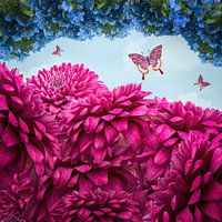 Bloemenvlinders bezoeken de onweerstaanbare kleuren van de Chrysanten en Hortensia.