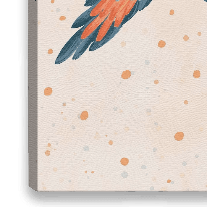 Geïllustreerde papegaai die vliegt in de rozehemel, en een regen van feestelijke stipjes onder zich heeft. Leuk voor in de kinderkamer of het kinderhoekje! De zachte kleuren maken deze poster ook geschikt voor andere kamers.