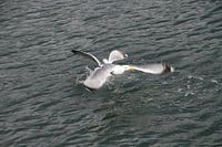2 Zeemeeuwen die elkaar verdringen omdat er wat te eten valt