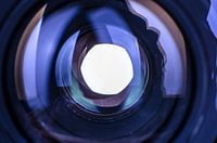De foto toont een indrukwekkende close-up door een cameralens. De focus ligt op het diafragma, waarvan de geometrische structuur wordt benadrukt door lichtreflecties en duidelijke lijnen. De lens is in koele blauwe tinten gehouden, wat de foto tegelijkertijd een technisch en esthetisch effect geeft.