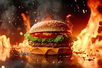 Een sappige hamburger, omgeven door gloeiende vlammen, ontvouwt zijn verleidelijke pracht. De combinatie van frisse groene salade, smeltende kaas en pittige ketchup trekt onvermijdelijk de aandacht en wekt de eetlust op. Perfect voor een keuken of eethoek waar smaak en passie voor lekker eten worden gevierd.