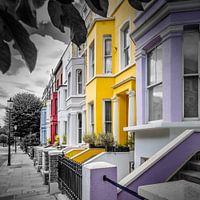 Deze scène in Colorkey toont een van de woonstraten in de Londense wijk Notting Hill, bekend om zijn kleurrijke gevels en elegante herenhuizen in Victoriaanse stijl. De compositie wordt natuurlijk omlijst door gebladerte op de voorgrond. De afbeelding straalt een gevoel van interieur en architectonisch evenwicht uit, een symbool van de stedelijke levensstijl, Britse stijl en kleurenharmonie van Londen.