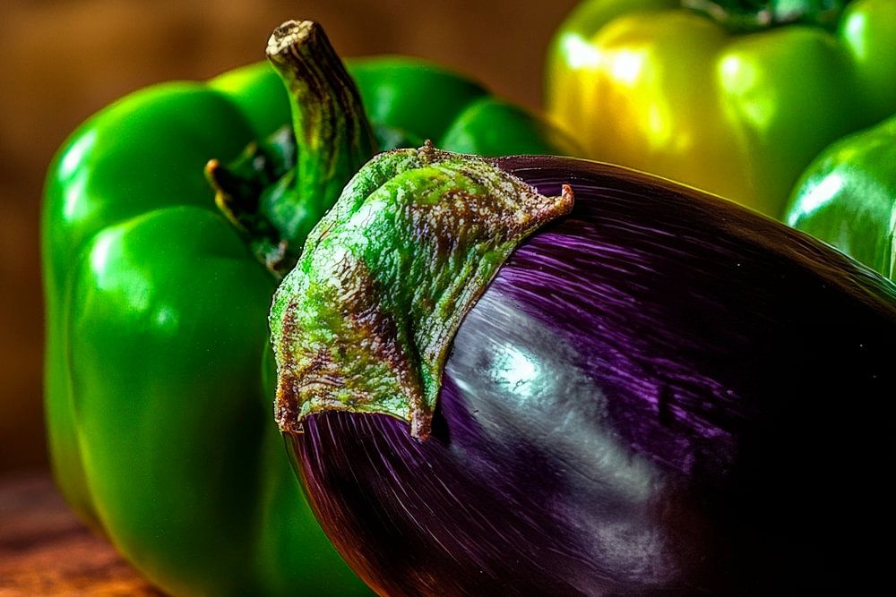Een levendig kleurenspel, waarbij de dieppaarse aubergine zachtjes tussen de felgroene paprika's ligt. Dit stilleven straalt frisheid en authenticiteit uit. Het is ideaal om in de keuken te hangen en brengt zowel gastronomische inspiratie als ontspannen flair in de kamer. Een waar feest voor de zintuigen!