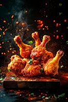 Te midden van een levendige actiescène schitteren gouden, krokante kippendijen prikkelend in het licht. Omringd door spetterende kruiden en een aantrekkelijke textuur roept dit visuele feest de verwachting van een heerlijk diner op. Deze afbeelding is perfect voor de keuken of eetkamer en maakt van elk culinair moment een belevenis.