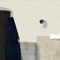 Abstract kunstwerk met grote, opvallende vormen in donker marineblauw en gedempte beige/grijstinten. De vormen lijken uit meerdere lagen te bestaan en creëren diepte zonder een duidelijke focus. De kleuren zijn zacht en gedempt, met accenten in een lichter oranje. Penseelstreken en texturen zijn zichtbaar. De eenvoudige, heldere vormen…