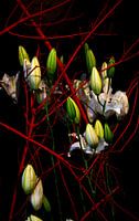 Op deze foto zijn de rode takken met de witte lelies en nog groen in de knop een mooi contrast. Grillige lijnen in combinatie met ronde vormen. Kunstwerk op zich van de mooie natuur.