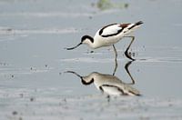 Een kluut in een typische houding. Deze vogel foerageert in ondiep water door met zijn kromme snavel heen en weer te bewegen op zoek naar kleine diertjes. Je ziet op deze foto de modder nog tussen zijn snavel zitten. De foto is genomen in natuurgebied "De Waverhoek" van Natuurmonumenten.