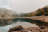 Prachtige foto van een meer waarbij de mist langzaam opkomt. Je ziet een klein beetje de reflectie van de bergen rondom het meer in het water. De prachtige herfstkleuren maken deze sfeervolle plaat helemaal af.
