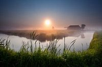 Mistige zonsopgang boven de rivier en charmante boerderij. Groningen. Nederland