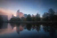 Mistige zonsopkomst bij het Malieveld in Den Haag met de skyline op de achtergrond.