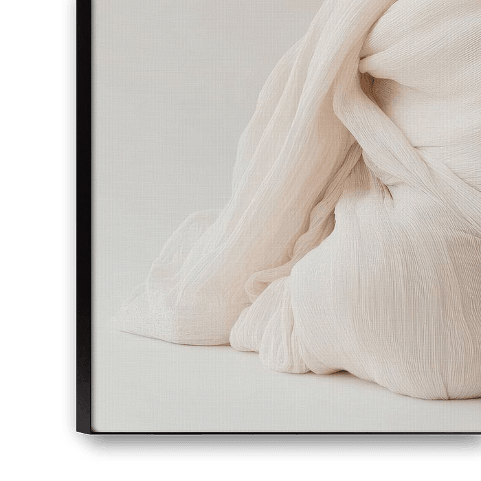 Een poëtisch en verstild beeld dat de menselijke vorm vangt in een moment van overgave. De figuur, gehuld in een bijna doorschijnende, geplooide stof, lijkt zich langzaam op te lossen in zijn omgeving. Het werk roept gevoelens op van kwetsbaarheid, introspectie en transformatie. De zachte textuur en serene tonen maken dit een krachtig en meditatief werk — ideaal voor een ruimte die rust, diepgang en contemplatie wil uitstralen.