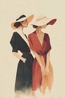 Een betoverend kunstwerk dat twee elegante vrouwen in vintage stijl uitbeeldt, gekleed in verfijnde jurken met opvallende grote hoeden. Het subtiele kleurenpalet van zachte beige-, zwart- en terracotta-tinten ademt een nostalgische glamour uit. Hun intieme conversatie spreekt van vriendschap en verfijning, terwijl de artistieke,…