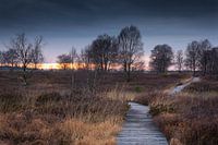 Zonsondergang op een houten vlonderpad bij de Hoge Venen / Hautes Fagnes in België.