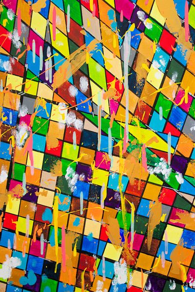 Dit levendige schilderij combineert een strakke, geometrische basis met een dynamische afwerking. De ondergrond bestaat uit een raster van ruitvormige vlakken in diverse felle kleuren (rood, blauw, groen, geel, wit, paars), wat doet denken aan een mozaïek. Hieroverheen zijn expressieve…