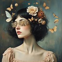 In “Flonkerende Dromen” wordt de schoonheid van de natuur samengevoegd met de fragiele essentie van de menselijke geest. De vrouw, met een betoverende bloemrijke haardos, straalt een aura van mystiek uit. De vlinders die om haar heen fladderen, symboliseren transformatie en vrijheid, terwijl de delicate bloemen de kracht van de natuur vertegenwoordigen. De warme, aardse kleuren en de etherische achtergrond creëren een dromerige sfeer die de kijker uitnodigt om te reflecteren op de wonderen van het leven. Dit kunstwerk, een prachtig voorbeeld van moderne surrealistische kunst, is een ideale keuze voor de kunstliefhebber die op zoek is naar unieke schoonheid. Voeg dit schilderij toe aan je collectie en laat de magie je ruimte vullen.