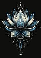 Een gestileerde lotusbloem schittert in zachte blauw- en wittinten tegen een zwarte achtergrond. De bloemblaadjes zijn rijkelijk versierd met fonkelende elementen die op sterren lijken. Deze harmonieuze compositie symboliseert spiritualiteit, zuiverheid en kosmisch evenwicht en nodigt je uit om even stil te staan en te dromen.