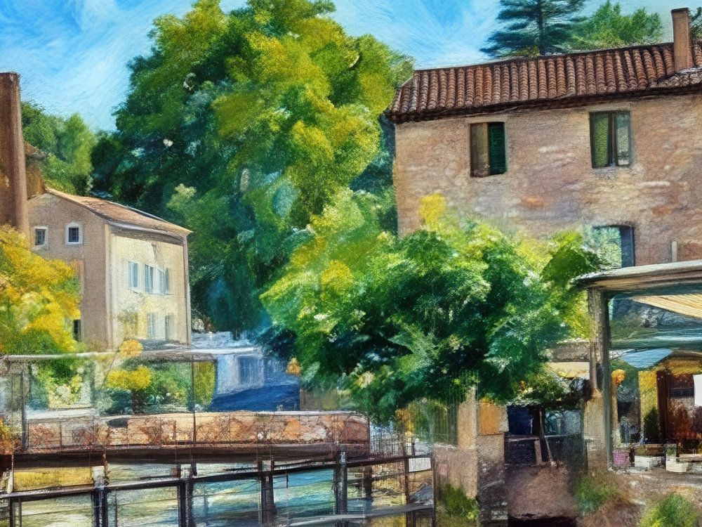 Een schilderachtig dorpje aan de rivier met historische gebouwen, een houten brug en een charmant openluchtcafé. De scène weerspiegelt de essentie van een vredige zomerdag, met weelderig groen, weerspiegelingen in het water en een helderblauwe lucht die de uitnodigende sfeer versterken.