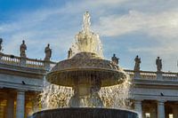 Mooie avondopname van de fontein op het Sint Pietersplein in Vaticaanstad, Rome, Italie. Avondopname waar de druppels en spetters mooi het laatste zonlicht weerkaatsen.
