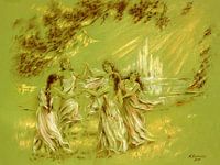 Erotisch spiritueel pastelschilderij, 100% handgeschilderd en handgesigneerd! Inspiratie was een bezoek aan het archeologische park "Fountain of Youth" in St. Augustin, Florida. Volgens de legende bevindt zich hier een fontein van de eeuwige jeugd. Op de achtergrond van het schilderij staat een fontein met zuiver bronwater, op de voorgrond dansende maagden.