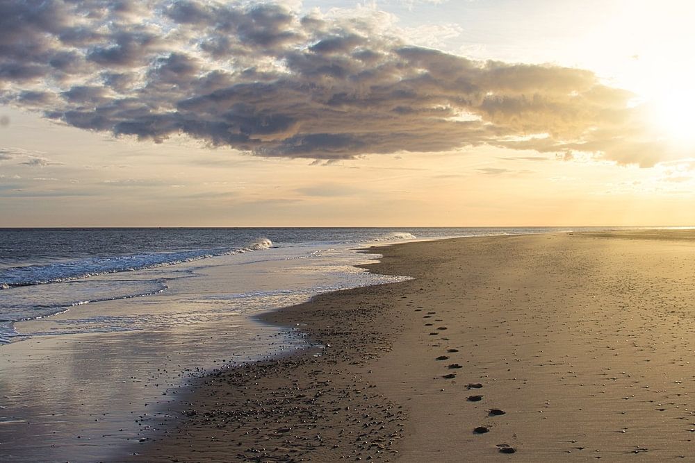 Voetstappen op het strand van De Cocksdorp op Texel. Met de net opgekomen zon en de spiegeling in het water een rustgevend plaatje.