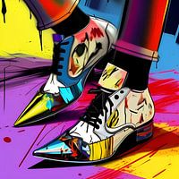 Graffiti-invloeden sieren de achtergrond, waar chaotische spatten van verf samenkomen om de rauwe energie van stedelijke kunst vast te leggen. Dit creëert een spannend contrast met de gestileerde en scherp gedefinieerde schoenen, waardoor het kunstwerk een dynamische en boeiende visuele ervaring biedt.