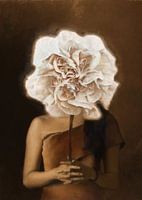 Mysterieus geschilderde fantasie portret van een vrouw met bloem in sepia tinten, gemengde techniek Mixed Media