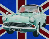 Dit schilderij van de Ford Anglia voor de Britse vlag is te koop in verschillende maten en kan zowel op doek als op hout en metaal worden afgedrukt. U kunt de peeling ook laten afwerken met een acrylplaat er overheen waardoor het meer diepte krijgt.