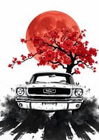 De afbeelding toont een klassieke Ford Mustang, geïllustreerd in de tijdloze stijl van sumi-e. Het iconische, krachtige silhouet van de auto is weergegeven met sterke, vloeiende penseelstreken, die een gevoel van vrijheid en rauwe energie oproepen. Een rode maan hangt in de lucht en werpt een intense gloed over het tafereel, terwijl levendige rode kersenbloesems zachtjes door de lucht zweven, wat een delicaat contrast toevoegt dat de gedurfdheid van de Mustang vermengt met de vluchtige schoonheid van de natuur.