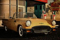 Hier afgebeeld is een Ford Thunderbird bij een oud benzinestation dat duidelijk in de Verenigde Staten ligt. Ik heb deze scène opzettelijk een warme gloed gegeven, het is een zomerdag daar in de woestijn, om een sfeervol beeld te creëren dat een plaats kan vinden in uw huis of kantoor.