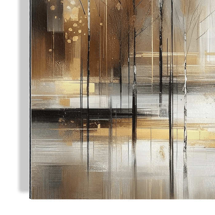 Laat de rust en schoonheid van de natuur tot leven komen in je ruimte met een prachtig abstract werk van bomen in een bos, gehuld in warme bruin- en goudtinten. De subtiele penseelstreken vangen de magie van een weelderig bos, waar de bomen in harmonie met elkaar dansen. De diepe kleuren wekken een gevoel van sereniteit en verbondenheid…