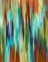 Abstract schilderij in olieverf op canvas, met verticale penseelstreken in groene, zeeblauwe en warme herfsttinten.