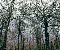 Oerbos met roze en paarsblauwe herfstbloesem, struiken met nog wat groene bladeren en dorre takjes. Een strakke lichte lucht, want het is al behoorlijk koud.