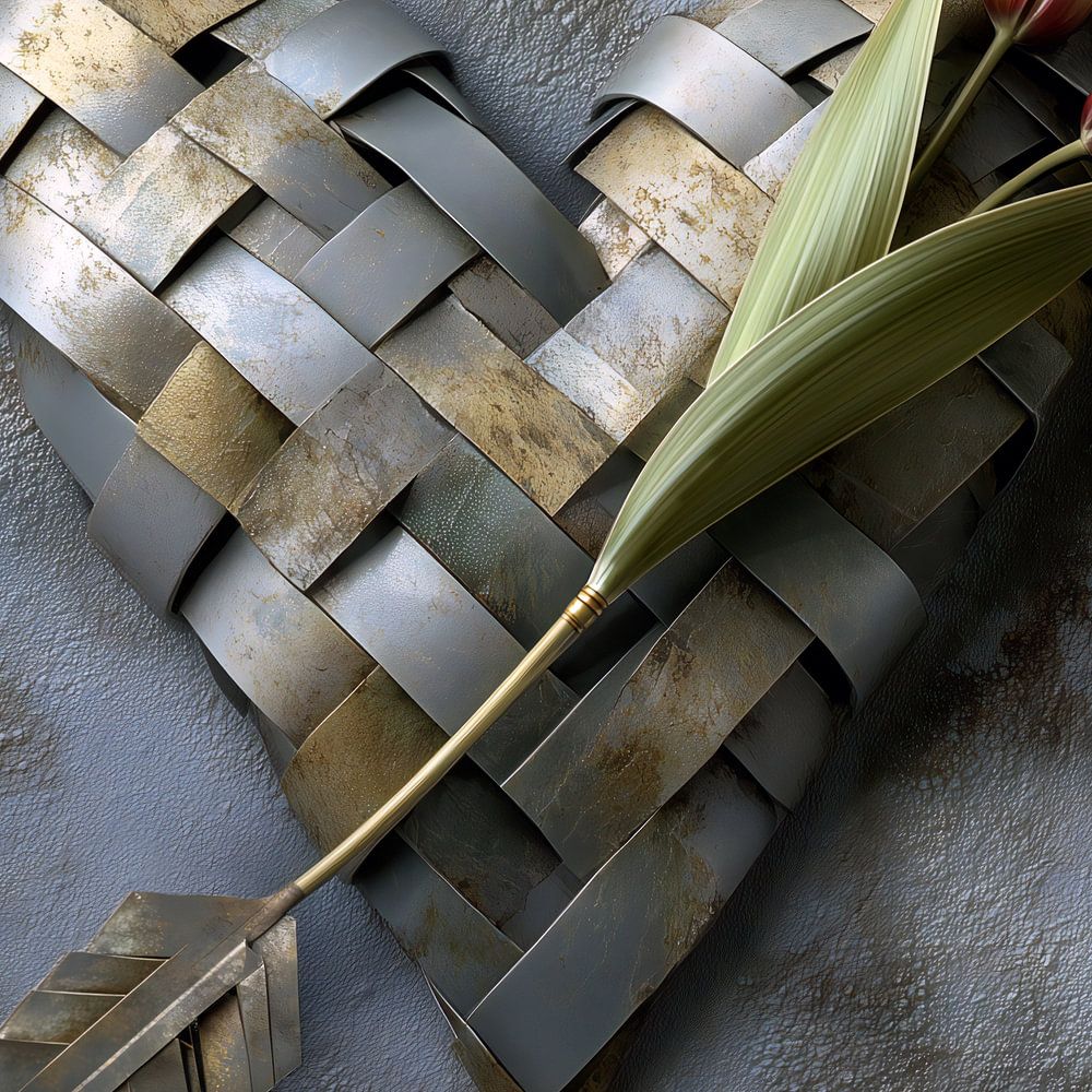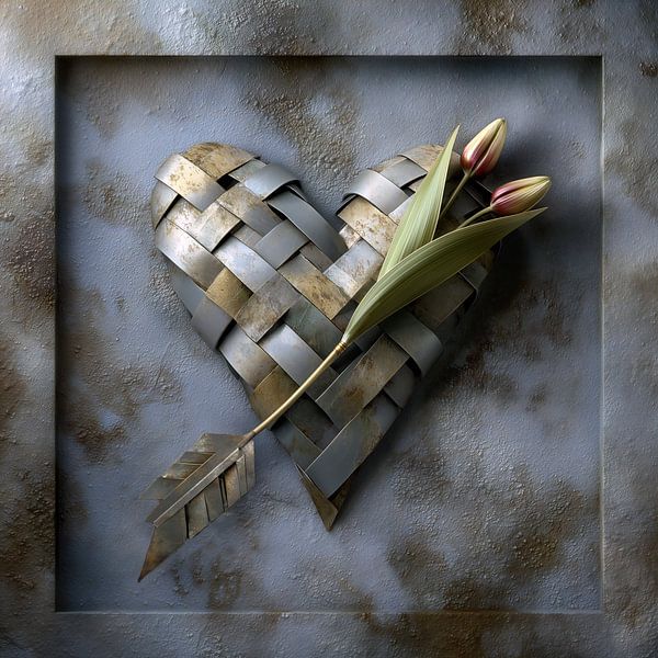 Een hart van gevlochten metaal met een pijl van tulpen in een ijzeren frame.