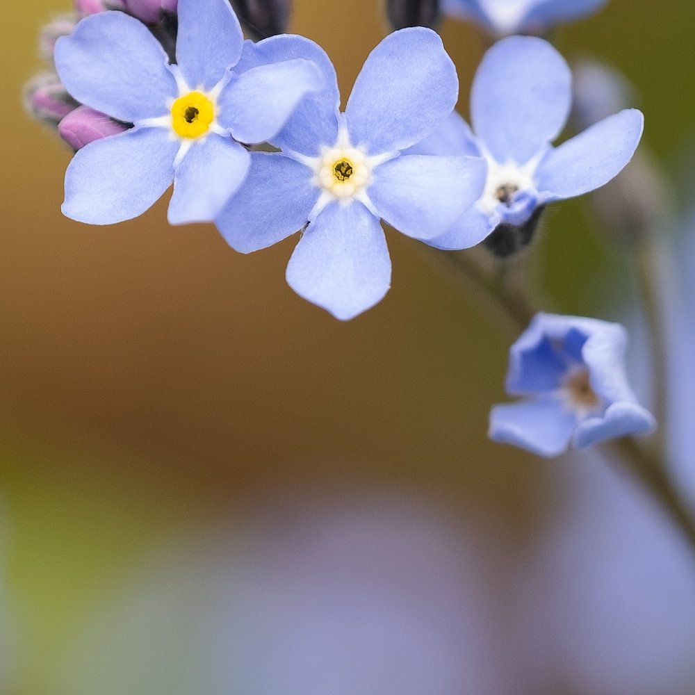 Een vergeet me nietje omgeven door pastelkleuren, romantiek ten top