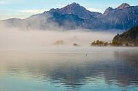 Forggensee en bergen boven Füssen in de mist op een herfstochtend