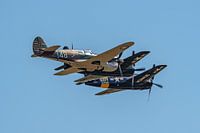 Flyby van een three ship gevormd door een Curtiss Wright P-40 Warhawk en 2 Grumman F8F Bearcats.