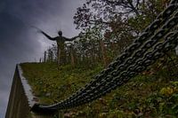 Beeld van wilgentakken op de talud om fort bij Vechten, gezien over een kabel vanaf de brug ernaar toe met een donkere lucht erachter voor effect