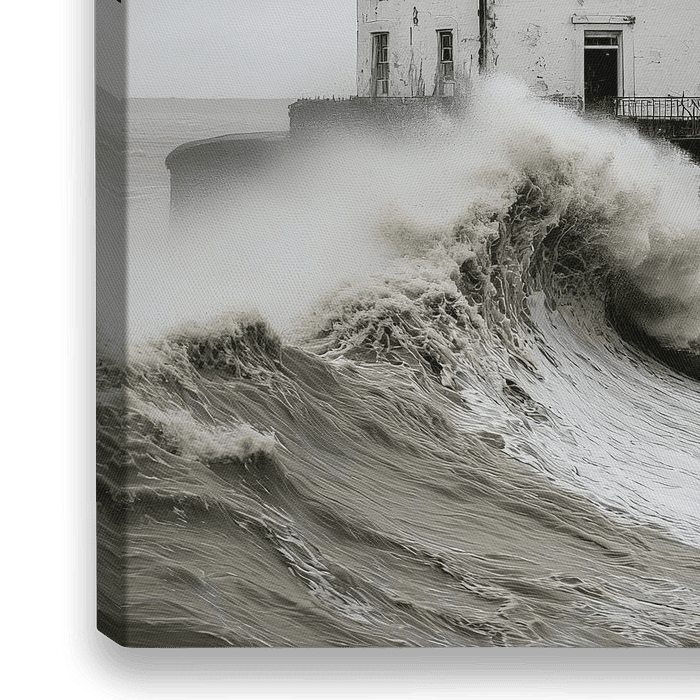 Koop dit digital art kunstwerk Fort in de storm - de vuurtoren trotseert de zee van Klaus Tesching - Art-AI als reproductie geprint op canvas, aluminium dibond, (ingelijste) fotoprint, behang en ArtFrame. Voor jou op maat geprint in Fine-Art kwaliteit.