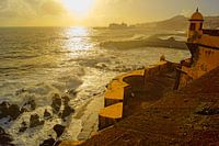 Forte de Sao Tiago in Funchal, Madeira, Portugal. Het gele fort ligt aan de Atlantische Oceaan die met grote golven op de rotskust beukt.