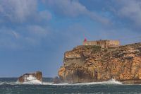 Golven breken op de rotsen van de kliffen onder het Forte de Sao Miguel Arcanjo in Nazare, Portugal.