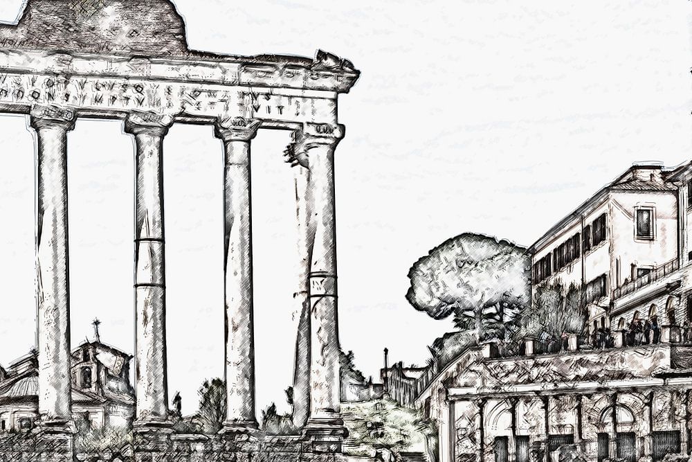 Forum Romanum met de Tempel van Saturnus en de overige drie zuilen van de Tempel van Vespasianus (rechts), Rome, Lazio, Italië, Europa