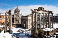 Sneeuw op het Forum Romanum in Rome, Italië. Een bijzondere omstandigheid die zich in de winter van 2018 voor het eerst in vele jaren voordeed.