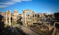 Zicht op de eeuwenoude gebouwen van het Forum Romanum, midden in Rome.