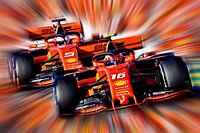 Photo montage and digital art by DeVerviers using photos by Jerry Andre with his kind permission (official photographer of Formula 1). Monegasque Charles Leclerc chased by Sebastian Vettel from Germany. Both were teammates at Scuderia Ferrari in the 2019 season.